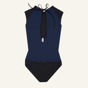 A sporty swimsuit with special details. With the contrast shoulder patches and the seam line you feel dressed and comfortable. This one piece offers you the best support while catching the waves and protects your shoulders from the sun. To tie in the back with a slim ribbon