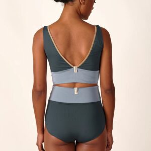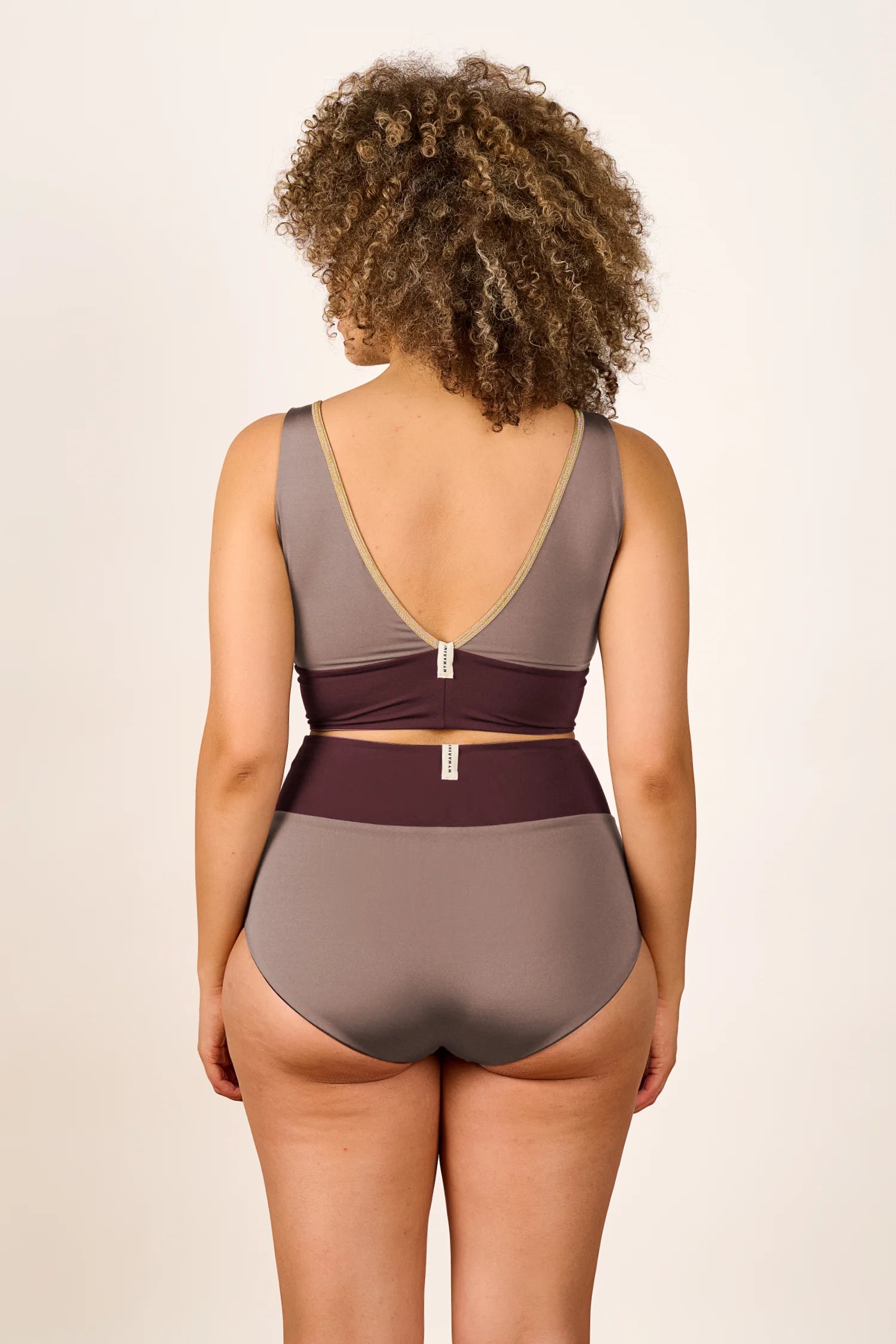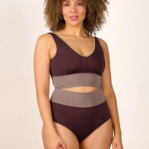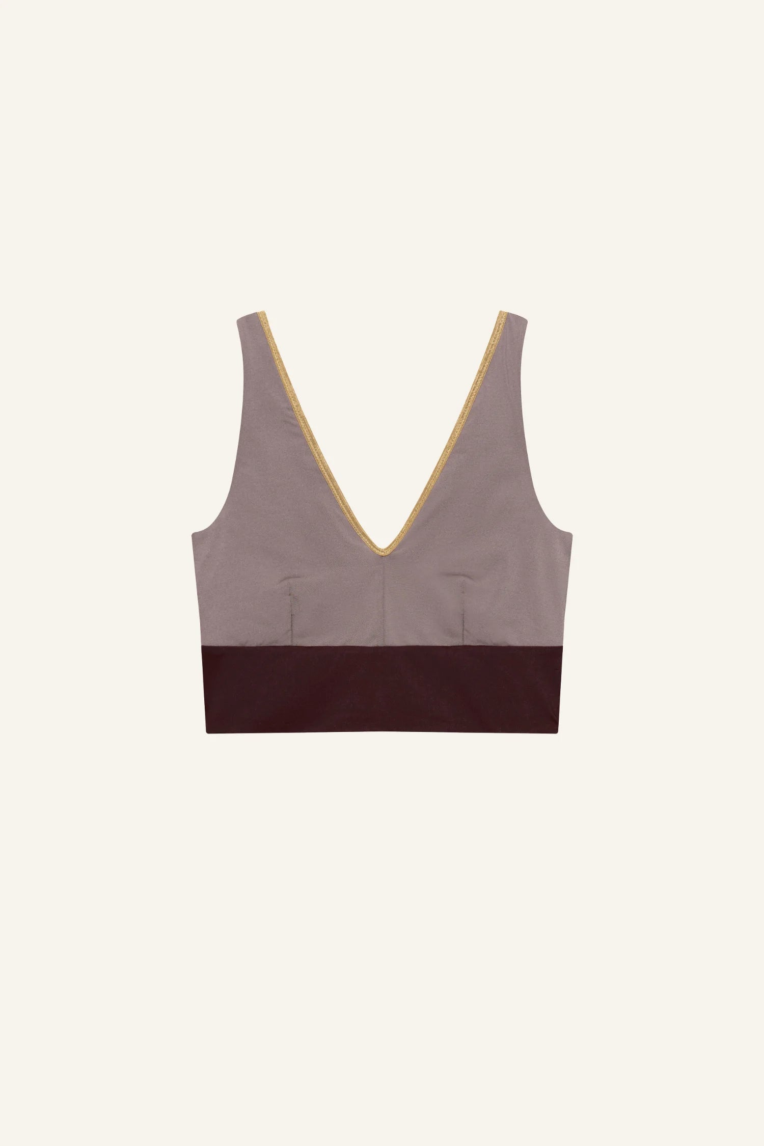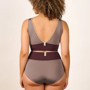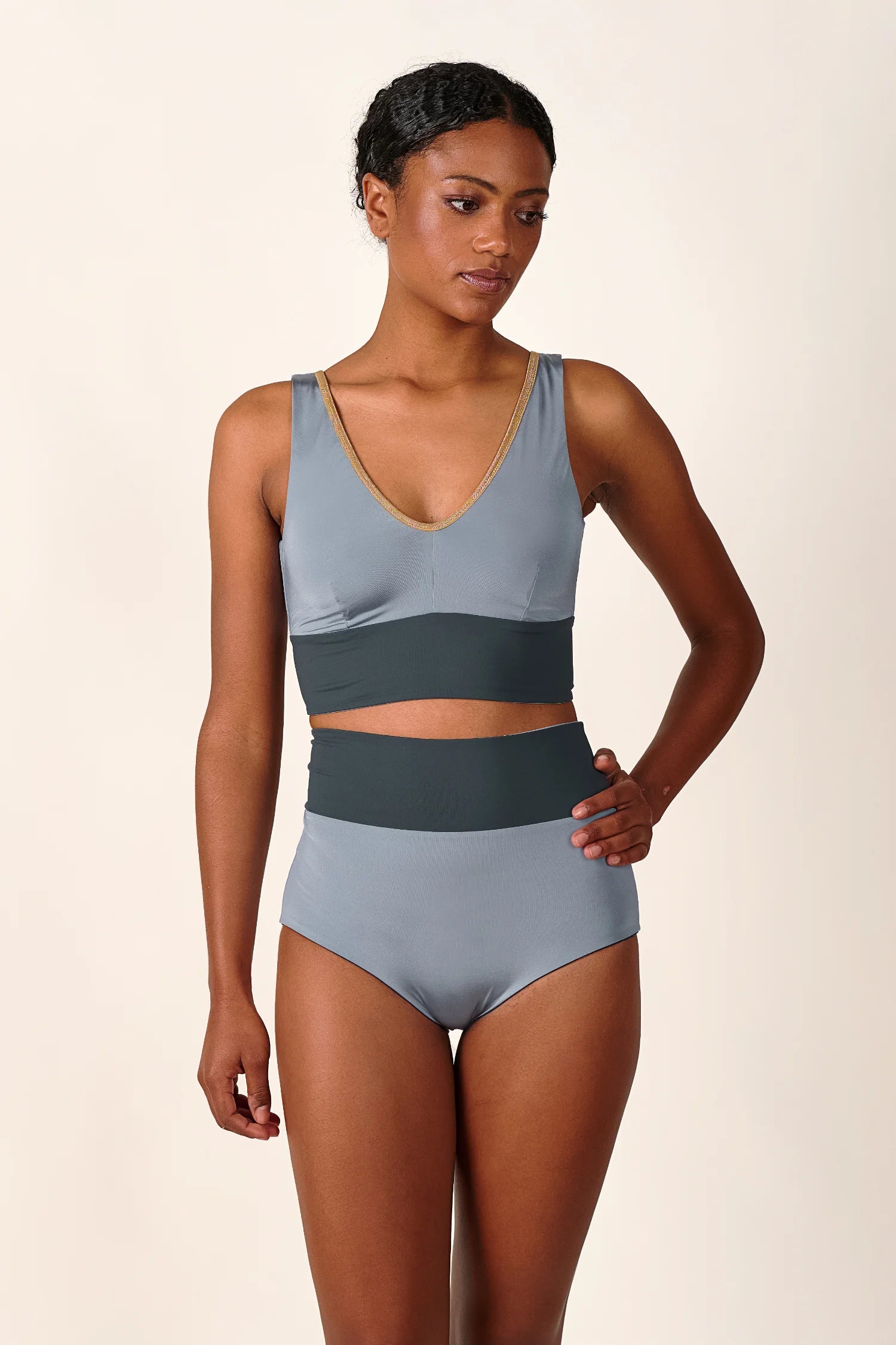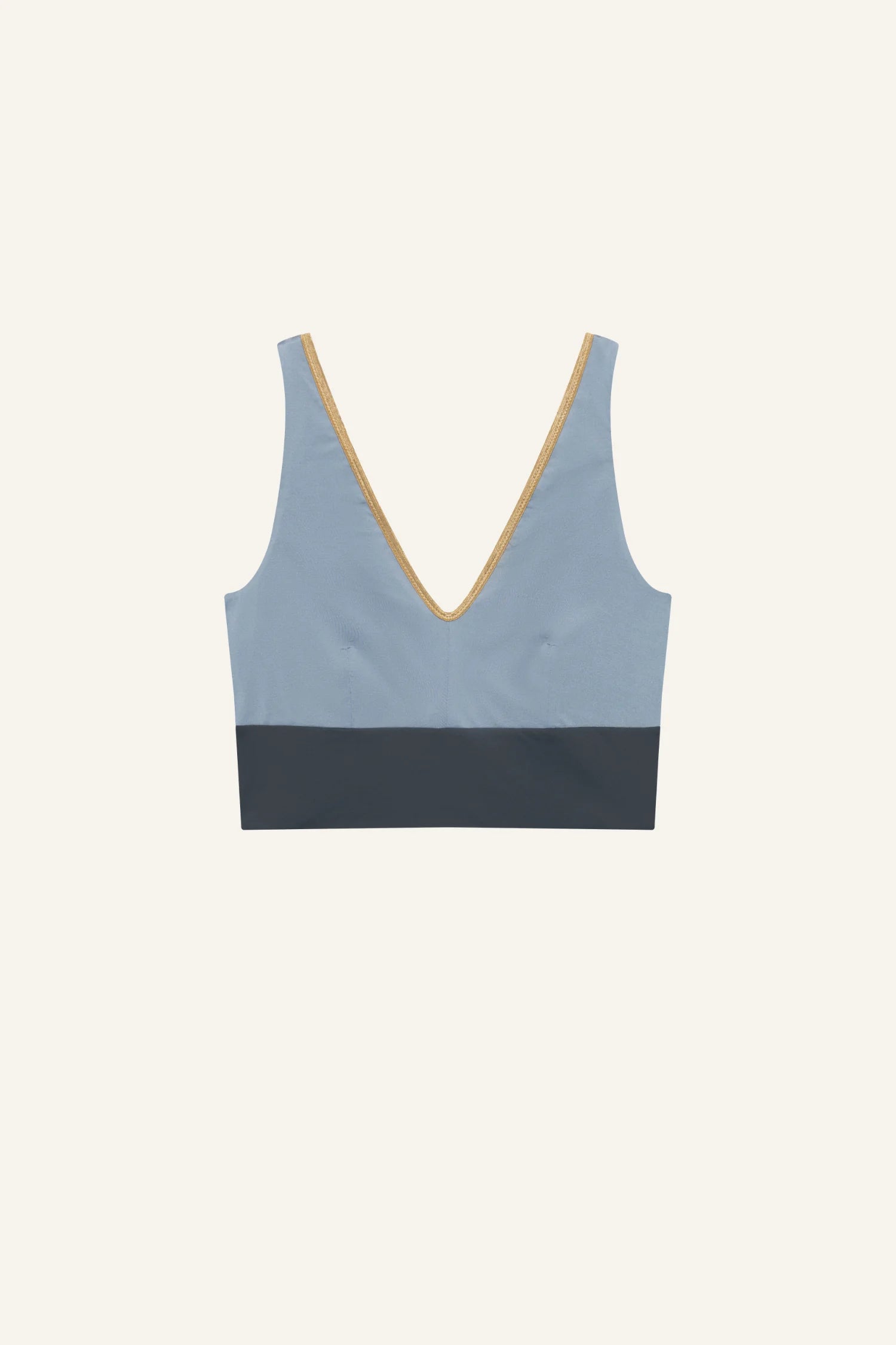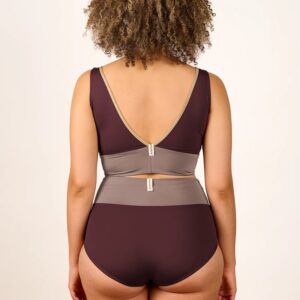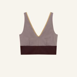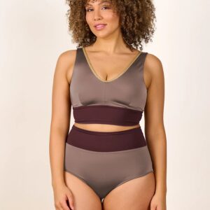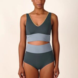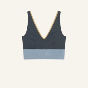 Inspired by a sports top, the YOGATOP is perfect for sports and movement. It is comfortable and provides excellent support for swimming, surfing, or your next yoga session with its wide underbust band. The feminine V-neck at the front and the deep back cut are adorned by the shiny SHINE edge. The golden accent beautifully complements the shimmering fabric of the bikini top.